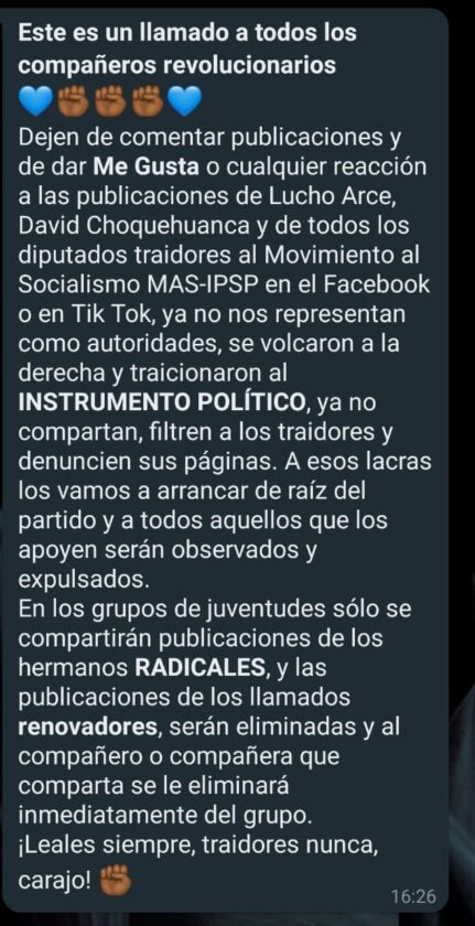 De acuerdo a la captura de un grupo de wasap se instruye que a los que compartan publicaciones en favor de Luis Arce Catacora, seran eliminados de las plataformas y pasaran hacer considerados traidores .