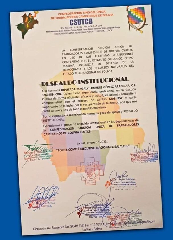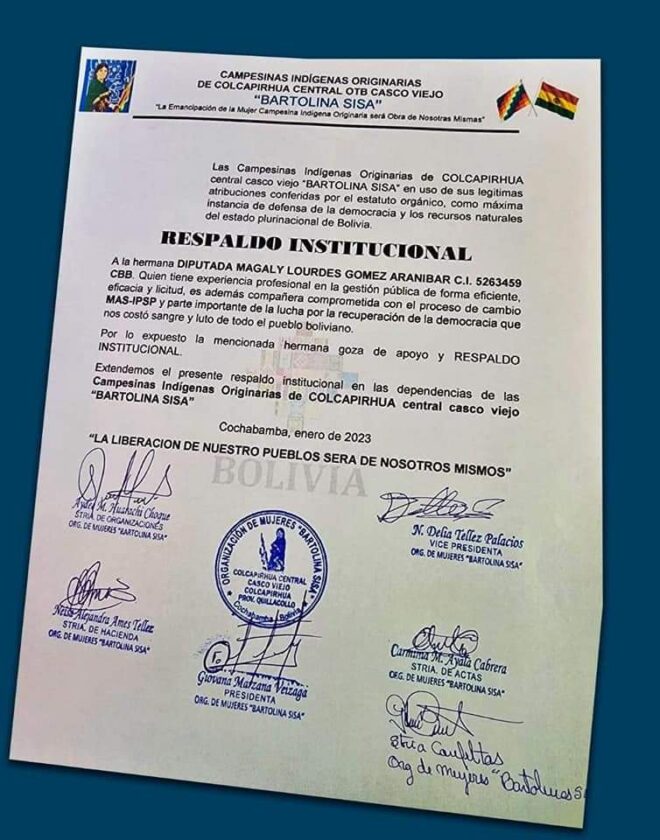 Tal parece que el distanciamiento de la estructura de dirigentes del MAS con las organizaciones sociales es evidente puesto que la Legisladora Magaly Gómez ,mientras es expulsada la federación de Bartolina Sisa y la misma CSUTCB , brindan el pleno respaldo a la mencionada Diputada que responde al sector de los llamados ´´renovadores ´´.