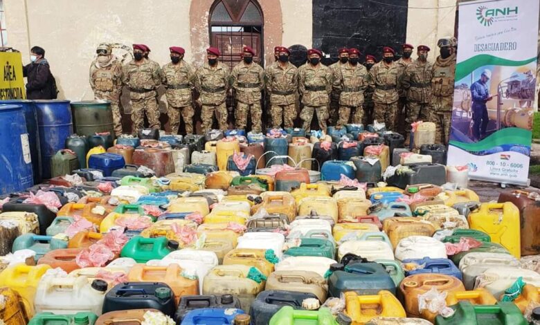 Se trata de 13.000 litros de combustibles líquidos y 132 garrafas de GLP incautados en el puesto de control fronterizo establecido en el Regimiento de Caballería Mecanizada – 5, Gral. José Miguel Lanza, ubicado en el municipio de Guaqui, provincia Inquisivi del departamento de La Paz.