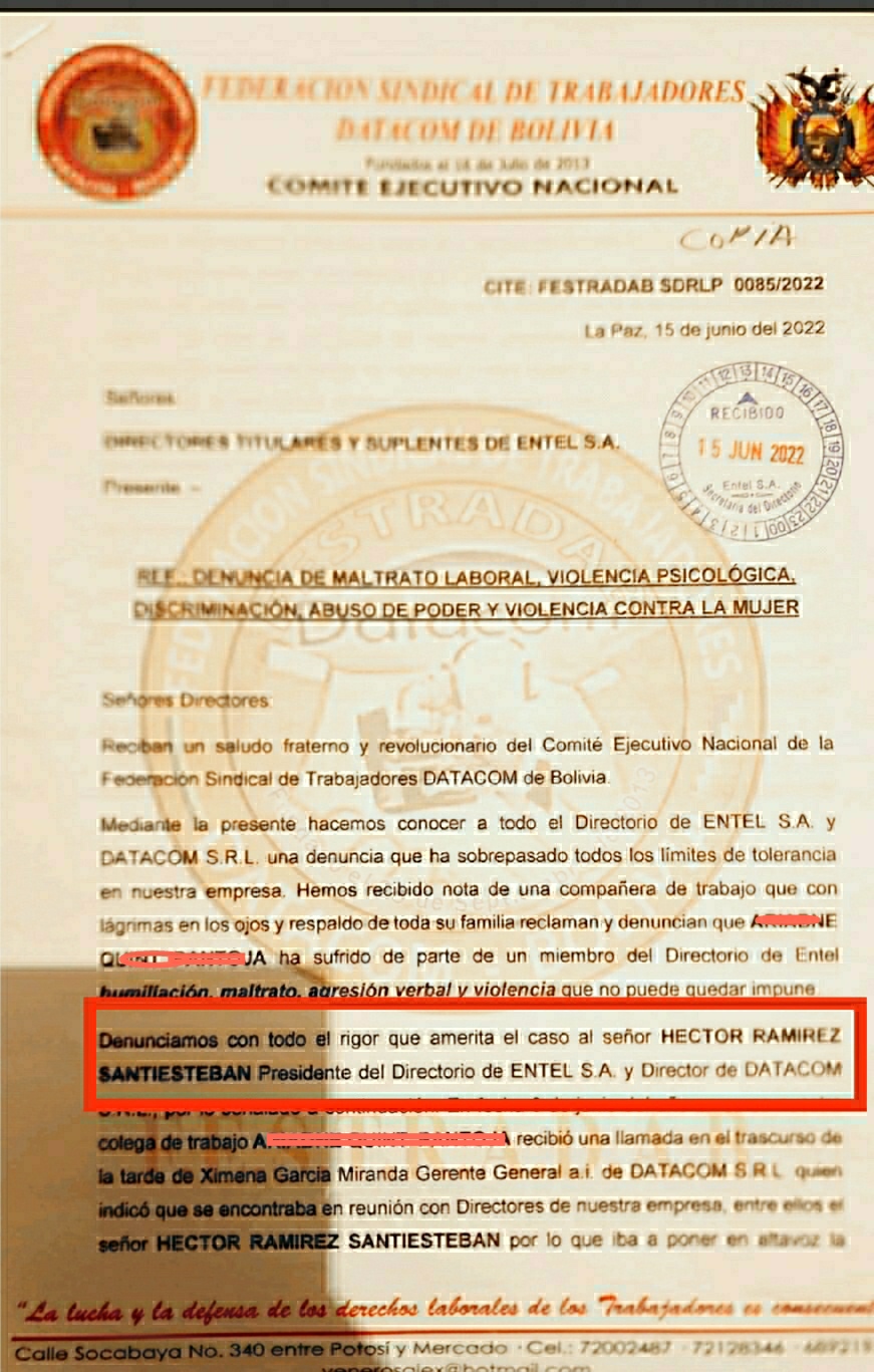 02 julio 2022 .-La Federación Sindical de Trabajadores de Datacom Bolivia , formalizó denuncia contra el Presidente del Directorio de ENTEL , Héctor Ramírez Santiesteban , por maltrato laboral ,violencia psicológica , discriminación , abuso de poder y violencia contra una mujer que habría cometido la Autoridad aprovechando su cargo .