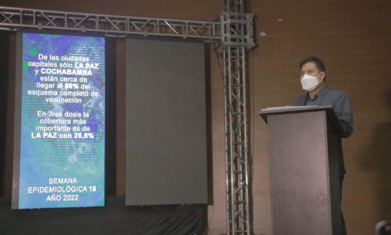 “Son datos reportados hasta ayer, domingo, en primer lugar está la ciudad de La Paz, que alcanzó en primeras dosis una cobertura del 89.3%, en segundas dosis el 78.1 % y en terceras dosis un 26.8%; en Cochabamba con esquema completo primario se ha alcanzado el 73.5% y con terceras dosis 22.4%”, expuso en el informe epidemiológico semanal que fue presentado en la capital de Bolivia.
