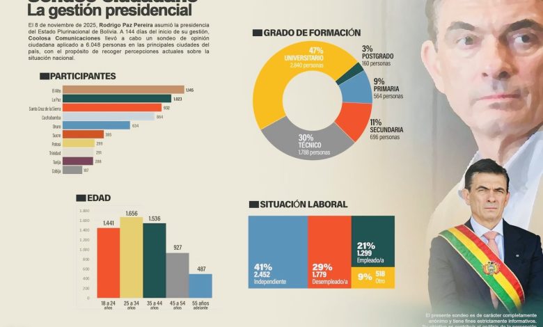 05 de abril 2026.- Coolosa realizó un sondeo que revela que la gestión del presidente Rodrigo Paz enfrenta un fuerte rechazo ciudadano a poco más de cuatro meses de gobierno.