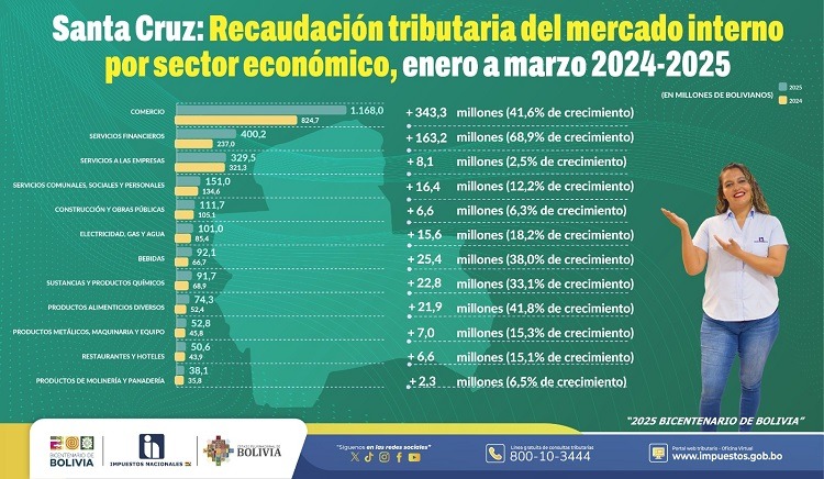 Esto significa que primer trimestre de 2024 el SIN cobró en el MI, a nivel nacional, Bs7.717,5 millones y entre enero y marzo de 2025, Bs9.285 millones.En el departamento oriental, el sector económico del Comercio elevó el pago de impuestos de Bs824,7 millones (a marzo 2024) a Bs1.168 millones (a marzo 2025), con un incremento del 41,6% (Bs343,3 millones más).