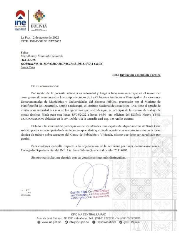 Domingo 14 de agosto 2022.- Luego que el Gobierno oficializó la invitación a las principales autoridades de Santa Cruz de la Sierra, a la reunión de coordinación y socialización del Censo , prevista para este lunes 15 de agosto, se informó que todas las autoridades universitarias , municipales y de la Gobernación confirmaron su asistencia .