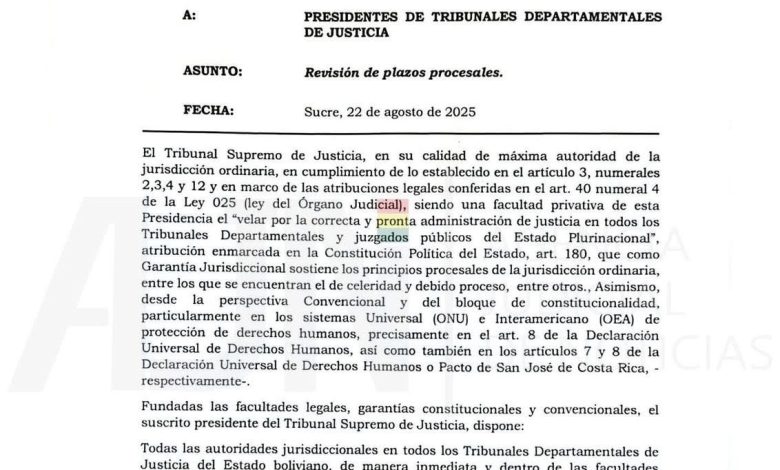 22 de agosto 2025 .- Mediante Instructivo N°18/2025, de fecha 22 de agosto, se instruye, la revisión de manera inmediata y dentro de las facultades constitucionales, convencionales y legales, en el plazo de 24 horas computables desde su notificación, a todos los Tribunales Departamentales de Justicia que procedan a la verificación del cumplimiento de plazos de la medida cautelar personal de detención preventiva en todos los procesos que tuvieran en su contra los ciudadanos: Jeanine Añez Chávez, Luis Fernando Camacho Vaca y Marco Antonio Pumari Arriaga.