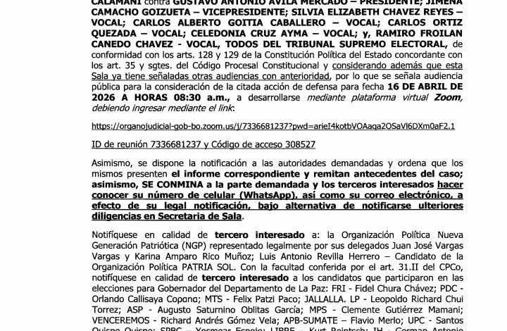 Además, se observa otra determinación del ente electoral que rechazó la solicitud de Yahuasi para participar en la contienda, lo que motivó la acción legal. Con esta decisión, el proceso queda a la espera de una audiencia en la que se evaluará el fondo del caso y se definirá si las resoluciones del Tribunal Electoral continúan vigentes o son anuladas
